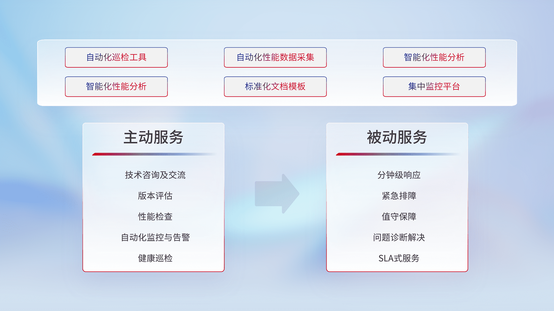 智能化工具和标准化文档,,保障服务质量,,,,提供主动服务(包含技术咨询、、、、版本评估、、性能检查、、、、自动化监控与告警、、、健康巡检)和被动服务包含(分钟级响应、、、紧急排障、、值守保障、、问题诊断解决、、、、SLA服务)。。